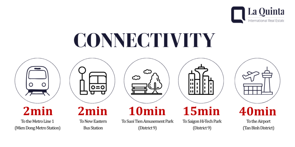 From the project, residents can reach District 1 in approximately 15 minutes via Metro Line 1, while enjoying seamless connections through major infrastructure including Hanoi Highway, National Route 1A, Ring Road 3, and Mai Chi Tho Boulevard. The location provides efficient access to Thu Thiem, Binh Thanh, District 7, and nearby provinces like Binh Duong and Dong Nai.