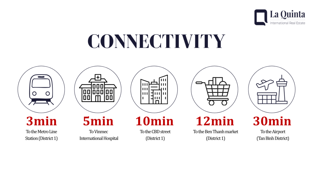Major international hospitals in the city such as Saigon International General Hospital and FV Saigon Clinic. Located in District 1, you are also within a 5 km radius from the residence, offering residents convenient access to premium medical services.