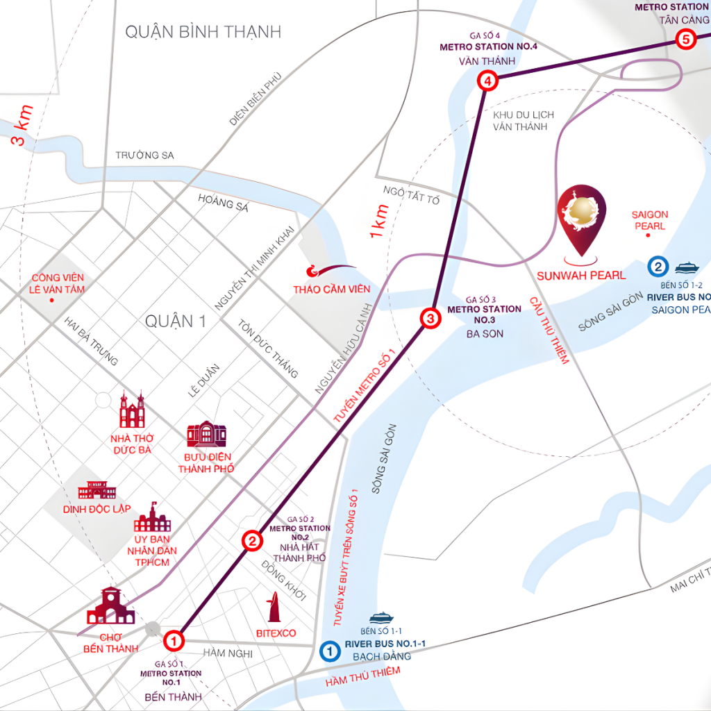 The location of Sunwah Pearl project is considered “a golden location in Ho Chi Minh city”. Not only build up right next to Sai Gon River, Sunwah Pearl project is also adjacent to the main Nguyen Huu Canh street. From that, this project enjoys a prime position between District 1, Binh Thanh District and the new Thu Duc City, convenient travel to the city center in less than 8 minutes.