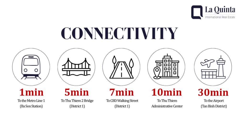 Residents enjoy seamless citywide connectivity via Ton Duc Thang Street, Nguyen Huu Canh Street, and Thu Thiem Tunnel. Key destinations such as Ben Thanh Market, Nguyen Hue Walking Street, and Landmark 81 are reachable within minutes. Notably, Vinhomes Golden River benefits directly from proximity to Metro Line 1 (Ben Thanh – Suoi Tien), with Ba Son Station located right next to the project, enabling fast, traffic-free access to District 1, Binh Thanh, Thu Duc City, and the eastern innovation corridor.